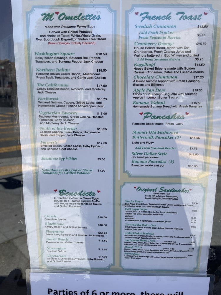 If you find yourself in San Francisco's Washington Square area, Mama's On Washington Square is a must-visit for a delightful breakfast or brunch experience. With a diverse menu that caters to both meat-eaters and vegetarians, Mama's offers a range of delicious options, from classic egg dishes to flavorful Benedicts. The cozy atmosphere, complete with outdoor seating and friendly service, enhances the dining experience. Customer reviews consistently praise the quality and taste of the food, with favorites like the French Toast, omelettes, and pancakes standing out. Whether you're in the mood for a hearty meal or a refreshing beverage, Mama's diverse beverage selection will surely satisfy your cravings. Don't miss the opportunity to enjoy a satisfying meal at Mama's On Washington Square, conveniently located in the heart of San Francisco. Your taste buds will thank you.